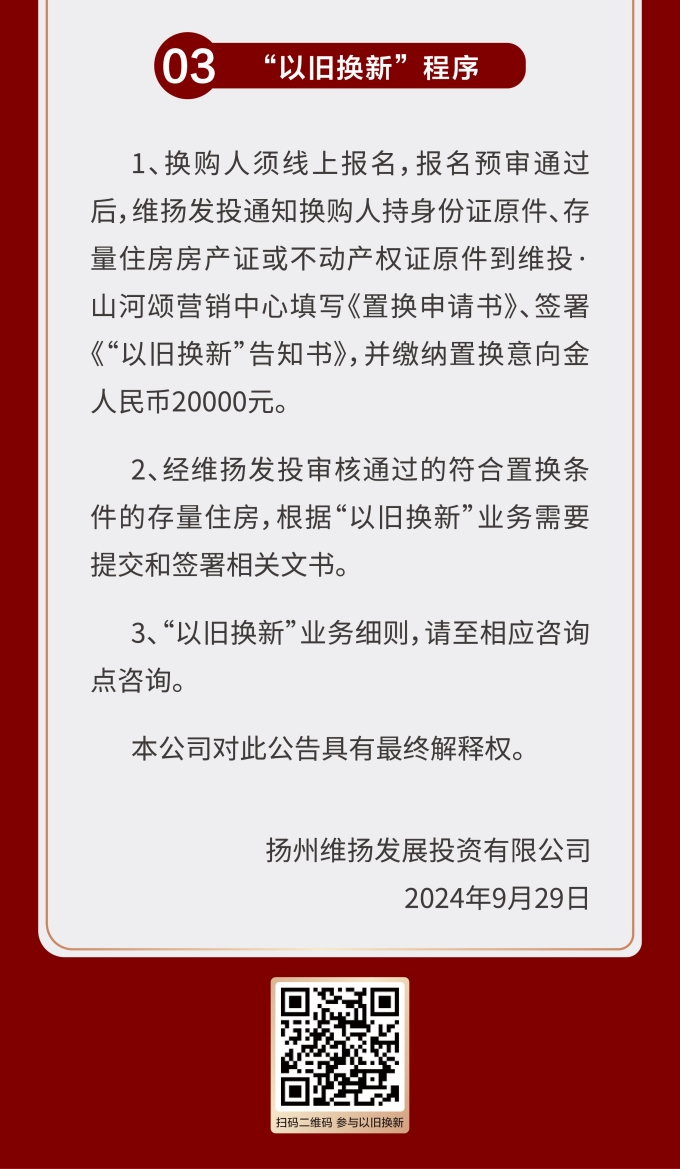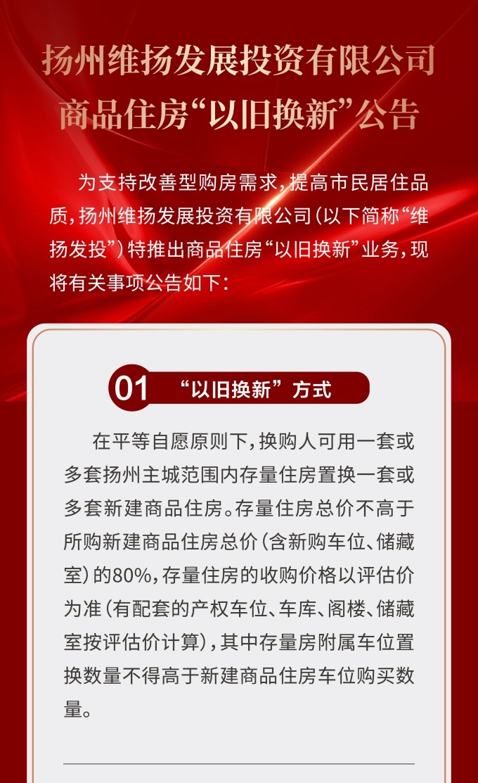 維揚地產(chǎn)積極響應政府新推行的“以舊換新”政策,踐行“惠民”理念,打造高品質(zhì)住宅,滿足揚州人民改善型住房需求。此次維揚發(fā)投“以舊換新”工作以其自主開發(fā)的維投·山河頌項目為試點,由國企背書、置換范圍廣、全流程專業(yè)服務。首批換購新建商品住房限額50套,換購人可通過登錄“維揚發(fā)投商品住房‘以舊換新’線上報名系統(tǒng)”報名,具體要求詳見公告。